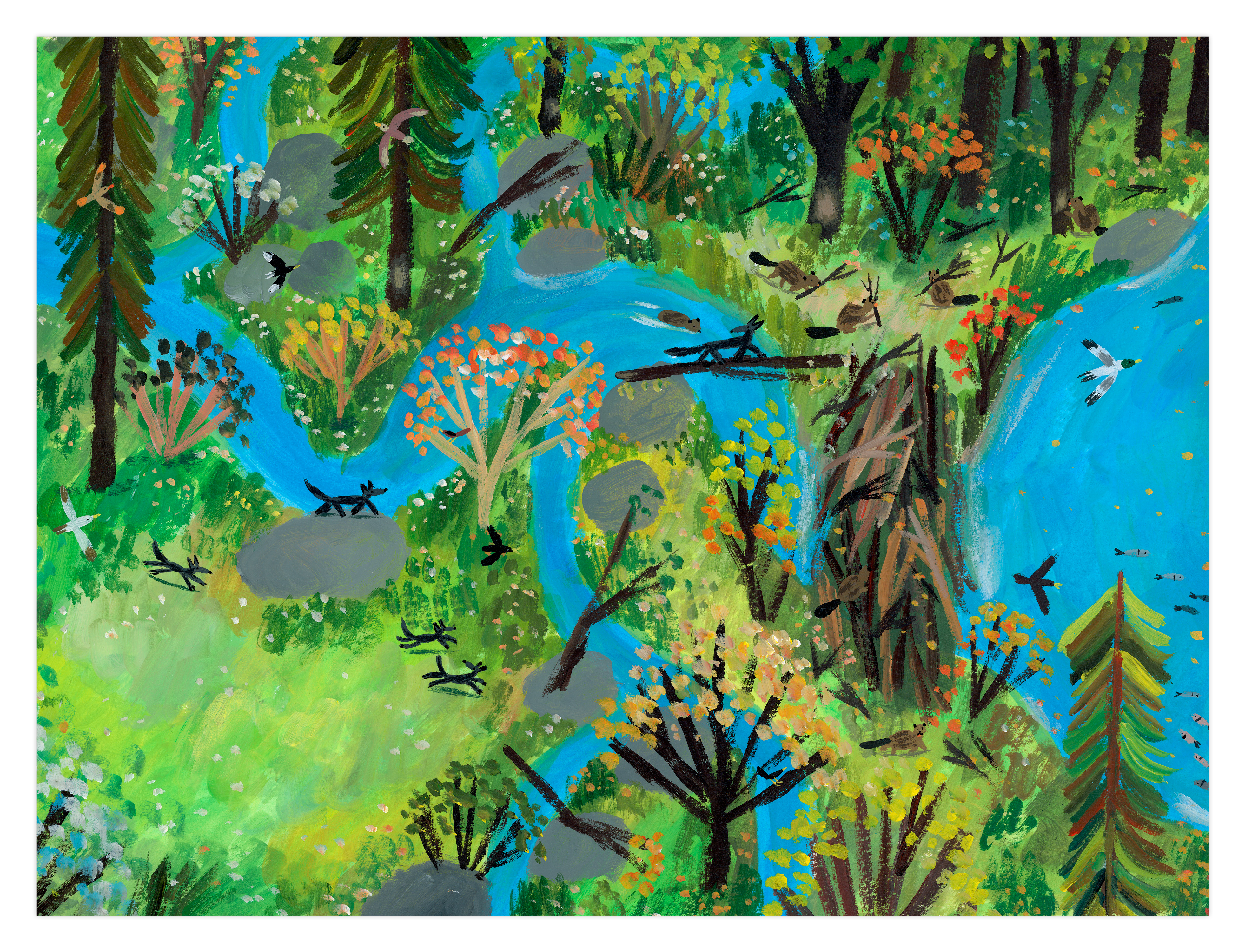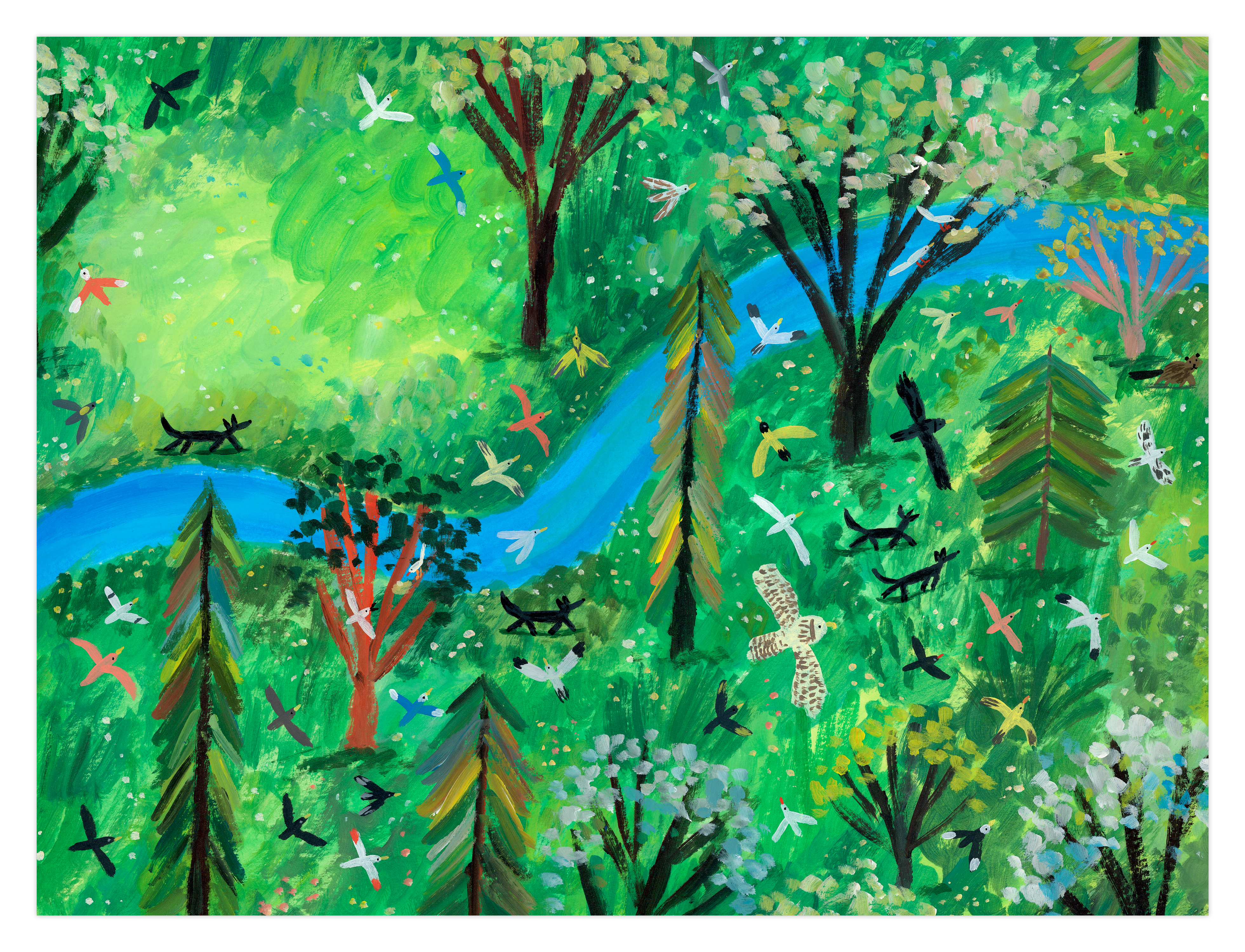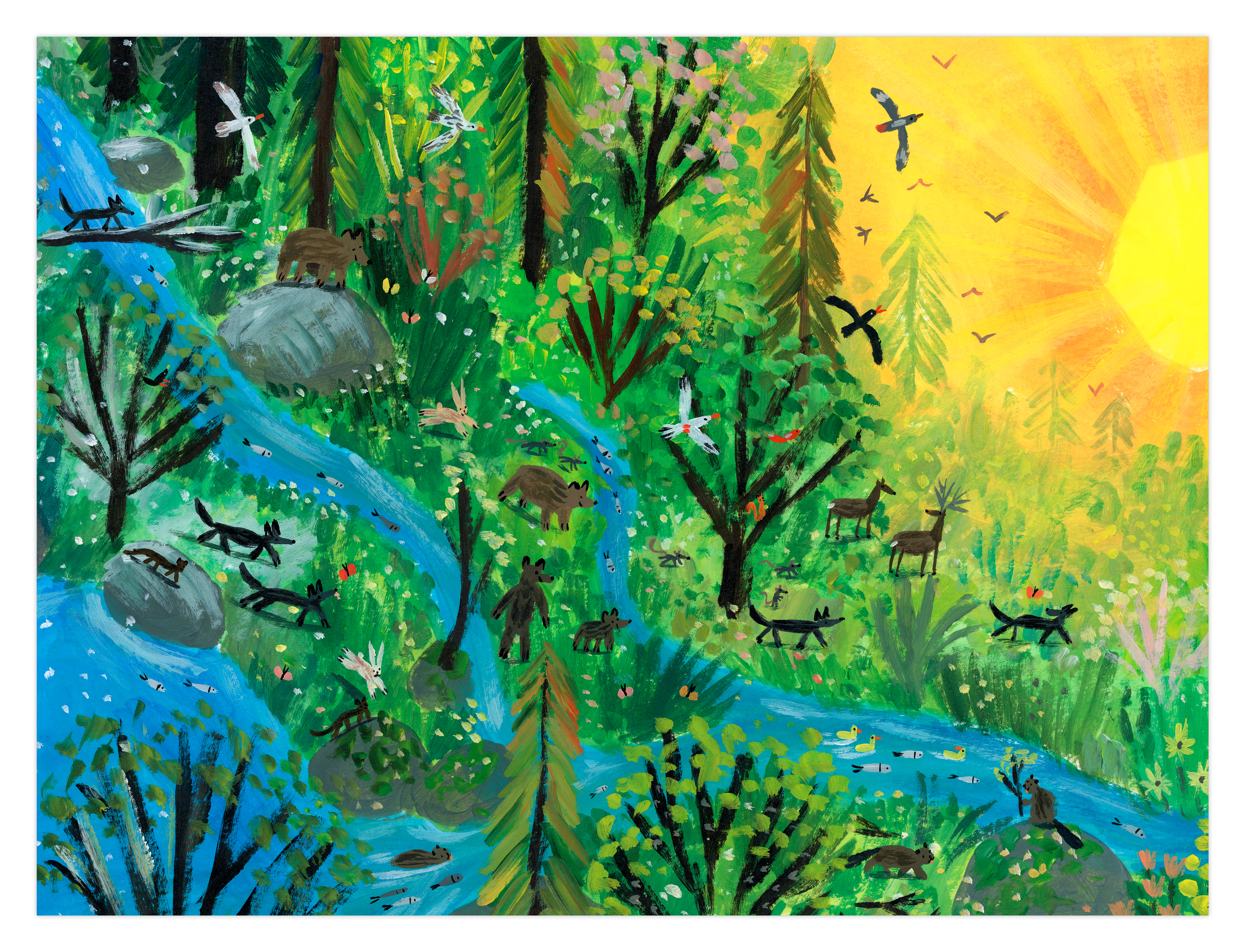 Les arbres repoussent, les oiseaux reviennent, les rivières se stabilisent, le milieu aquatique renaît et des petits mammifères surgissent. Tout le monde vit en harmonie dans un tableau final digne du Douanier Rousseau.
