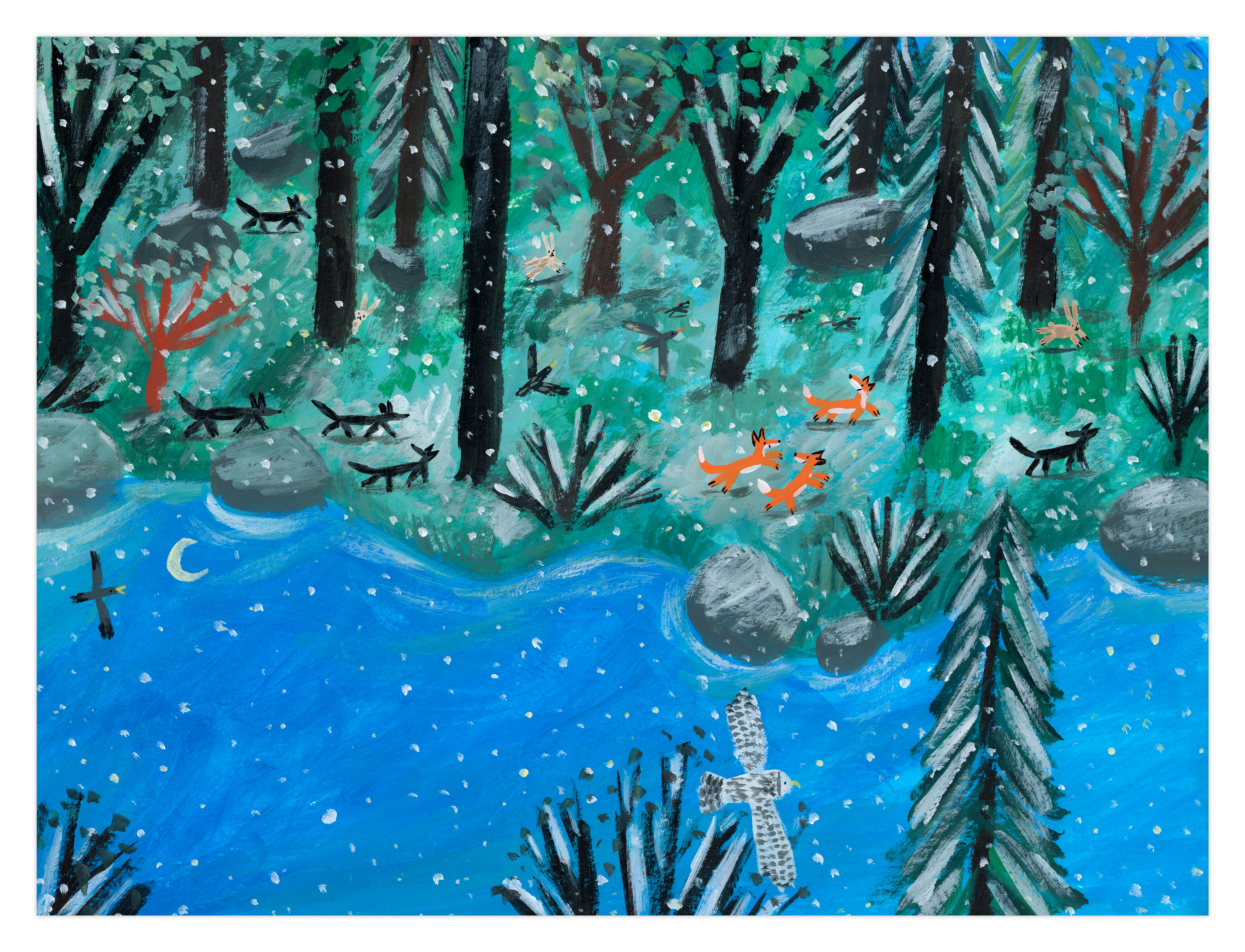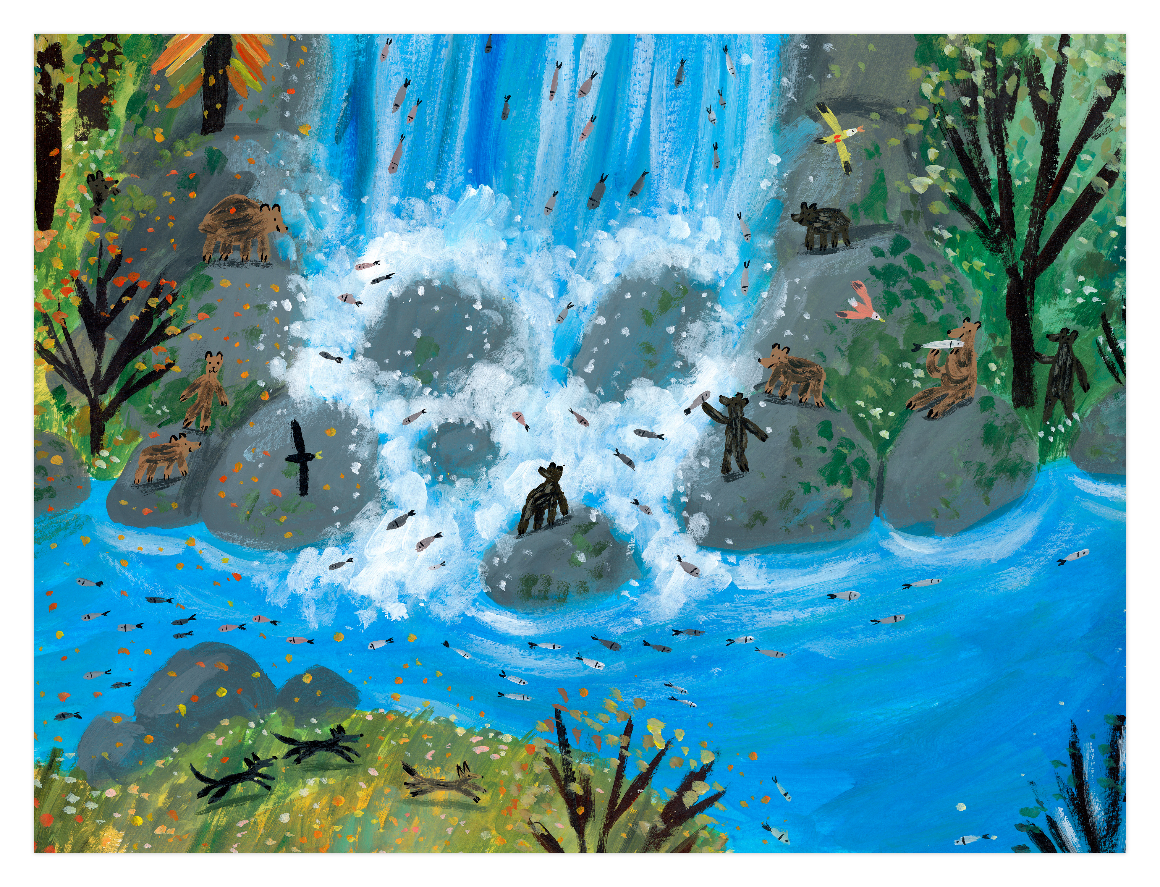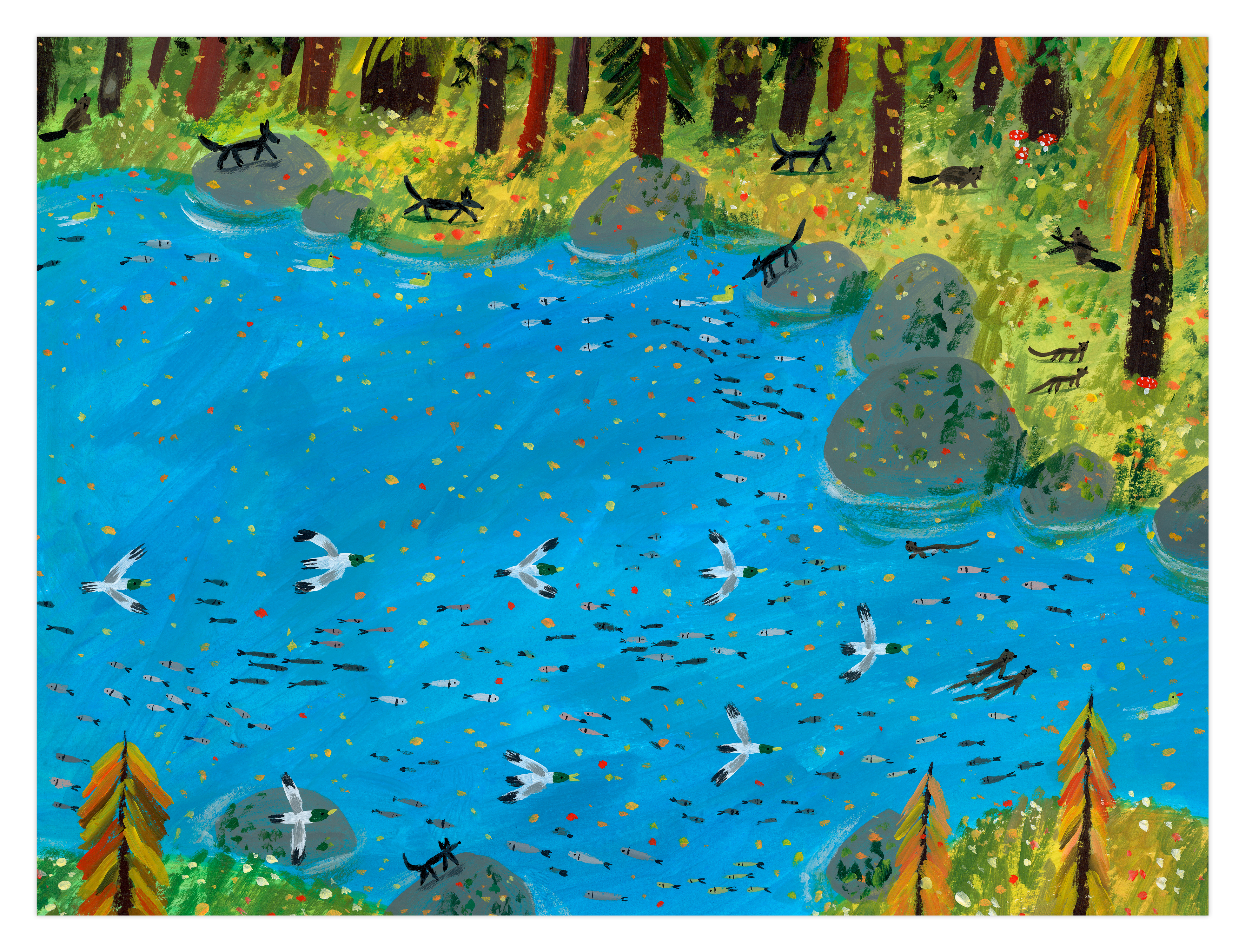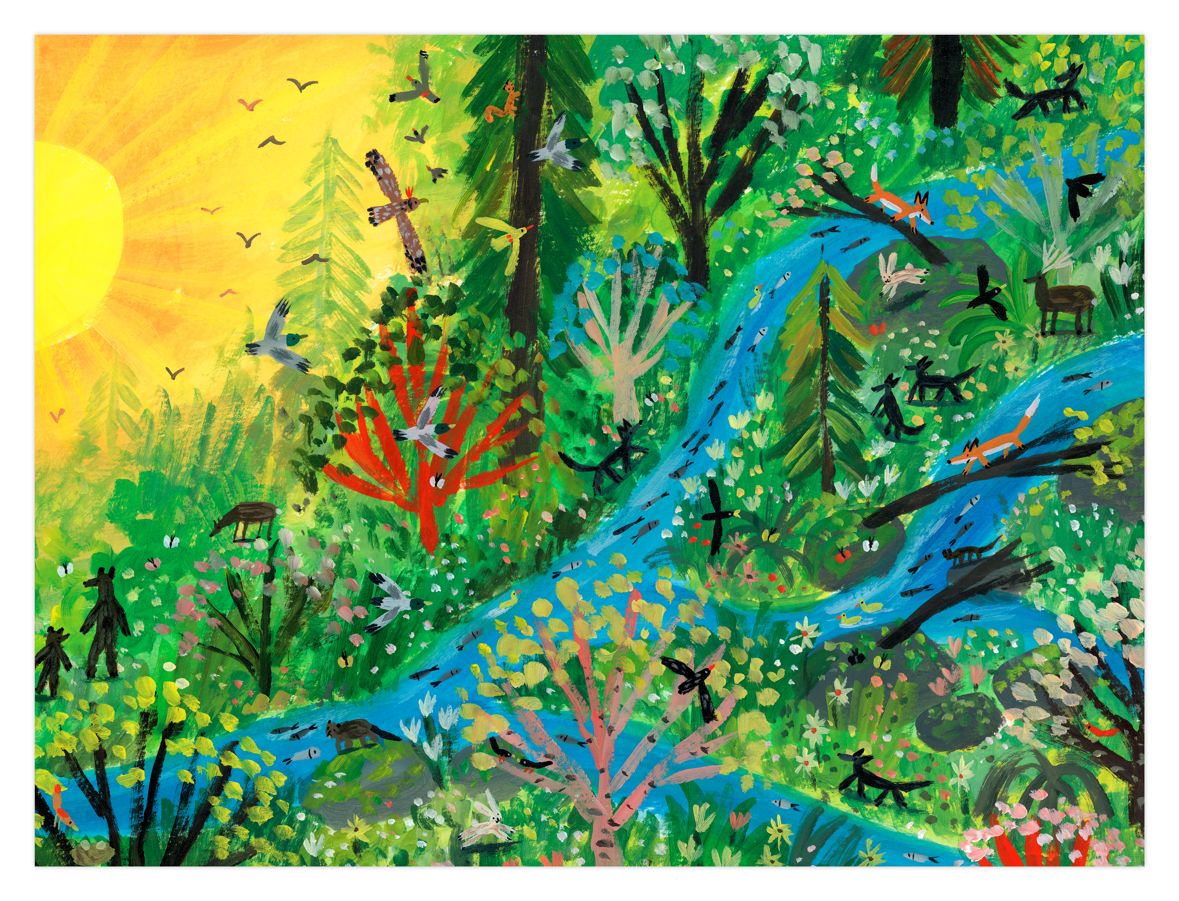 Les arbres repoussent, les oiseaux reviennent, les rivières se stabilisent, le milieu aquatique renaît et des petits mammifères surgissent. Tout le monde vit en harmonie dans un tableau final digne du Douanier Rousseau.