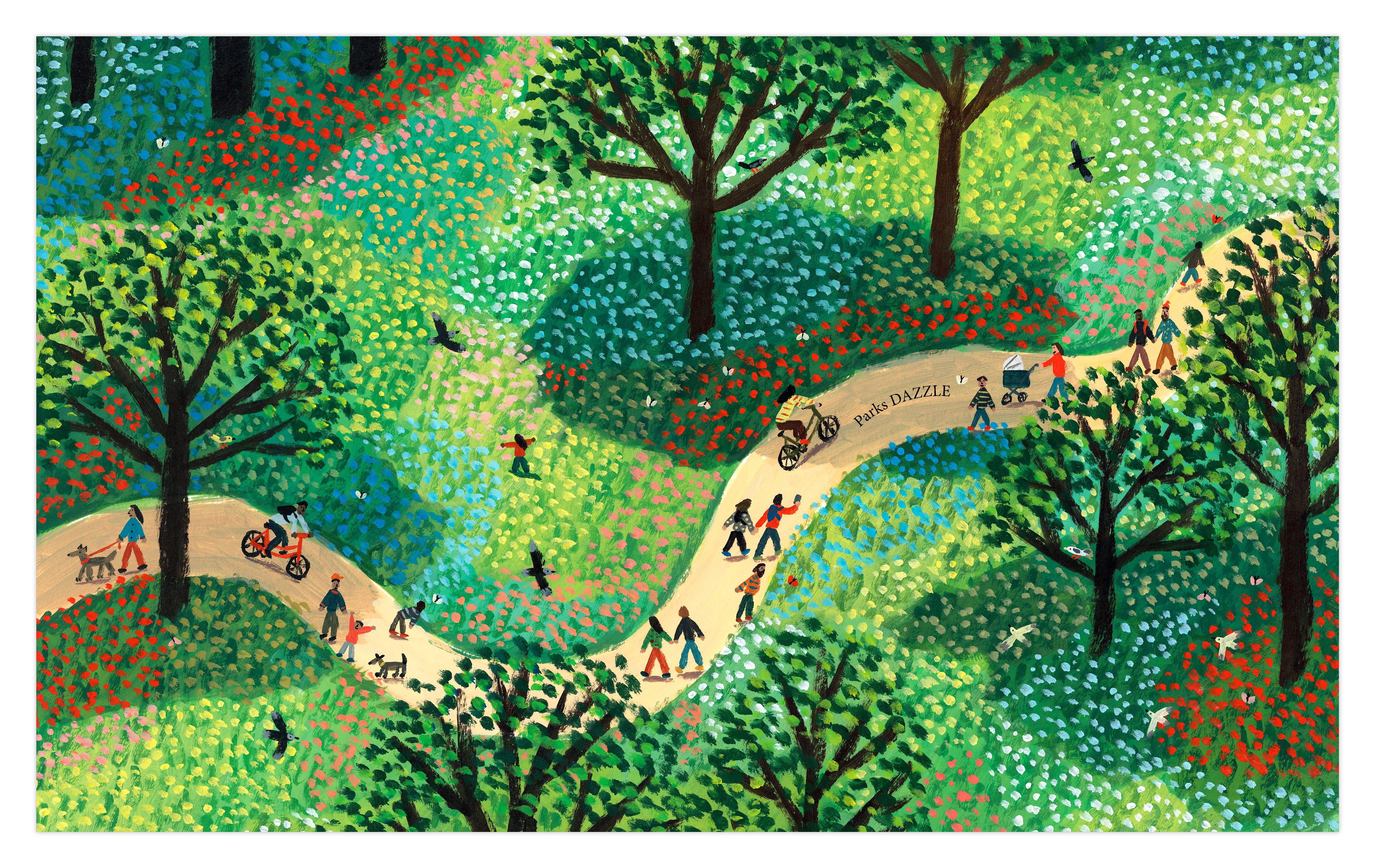 Parks can be big or small, quiet or loud, sunny or snowy. Parks protect the natural world, but they’re also public spaces where anyone can explore, gather, and play. Whether they’re wildlife reserves or your local dog park, wide open spaces or places of quiet in the city, deep in a canyon or just around the corner, parks can be a refuge.